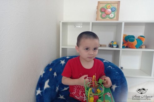 Ибрагим часто просыпается ночью, плачет, истерит, а в обед может хорошо спать от 1 до 1,5 часов. Просыпается чаще всего со слезами и криком. Ребенок социально не адаптирован: на горшок не просится, о желании пить или есть не говорит, все свои потребности выражает плачем. Мальчик не умет одеваться, не понимает для чего нужен карандаш, краски, телефон… Ибрагим гиперактивен, неусидчив, раздражителен, очень быстро ему все надоедает, он не может сконцентрироваться, присуща частая смена настроения.