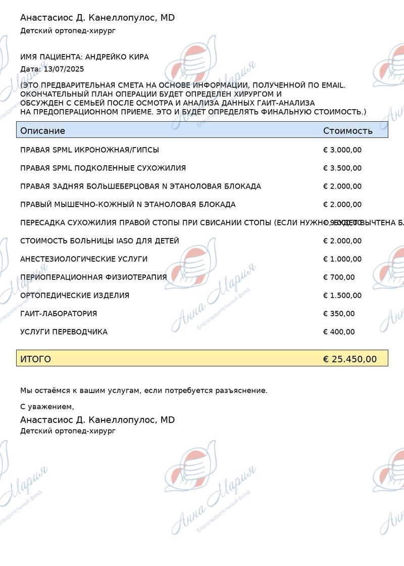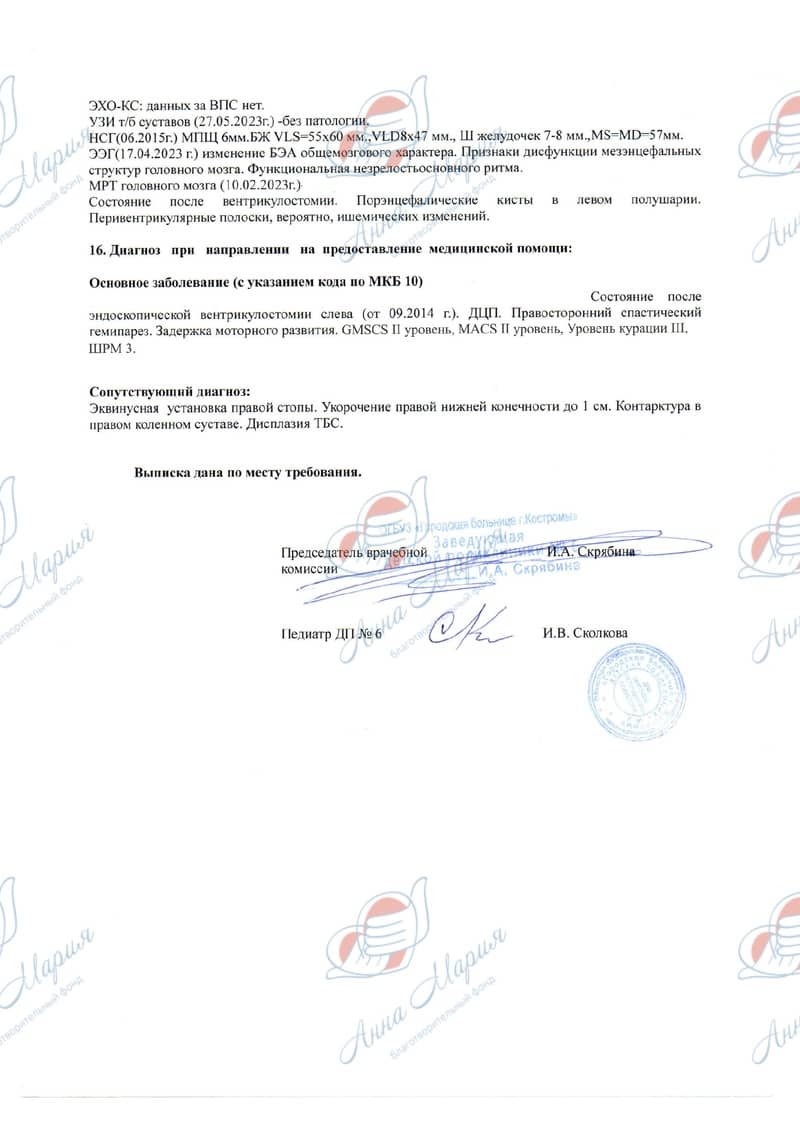 Врач, который ведет историю Киры, рассказал о малоинвазивной операции SPML, которая дает положительный результат в большинстве случаев. К сожалению, провести ее в России нельзя. Мама Киры организовала консультацию с доктором А. Канеллопулос из клиники в Афинах, который сказал, что может помочь. Он готов выполнить операцию – сделать несколько проколов, которые освободят мышцы от спастики, а специальные этаноловые блоки позволят удержать этот результат в тонусе. Уже через несколько месяцев Кира выйдет на физиологическую норму и начнет активную жизнь.