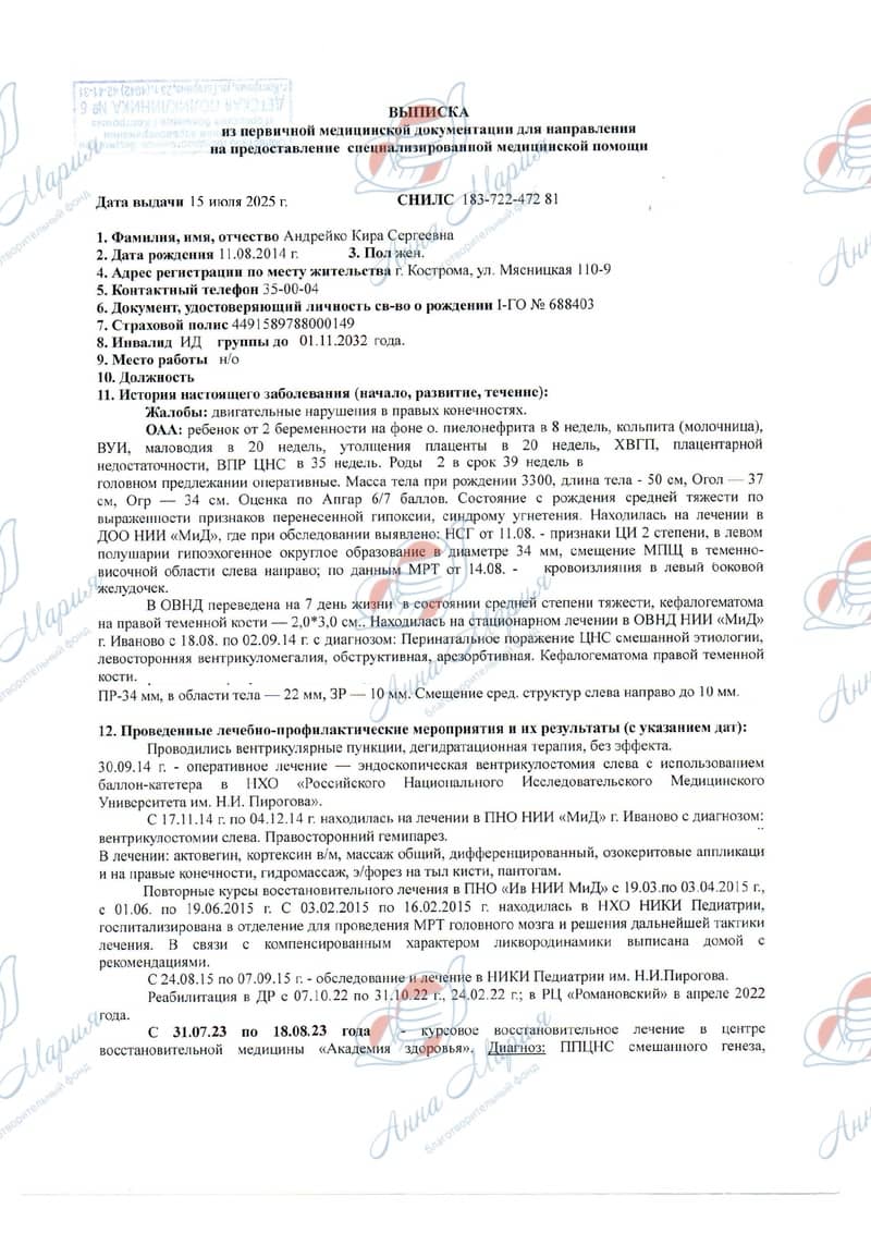 Кира родилась здоровой девочкой, но в течение нескольких часов после рождения у нее случился геморрагический инсульт, как следствие – кровоизлияние в головной мозг. Врачи провели экстренные меры и спасли жизнь малышке, но через неделю родители начали замечать первые последствия этого состояния. Кира перестала двигать правой ручкой и ножкой, кроме того, правая ручка у нее сжалась в кулачок и не разжималась.