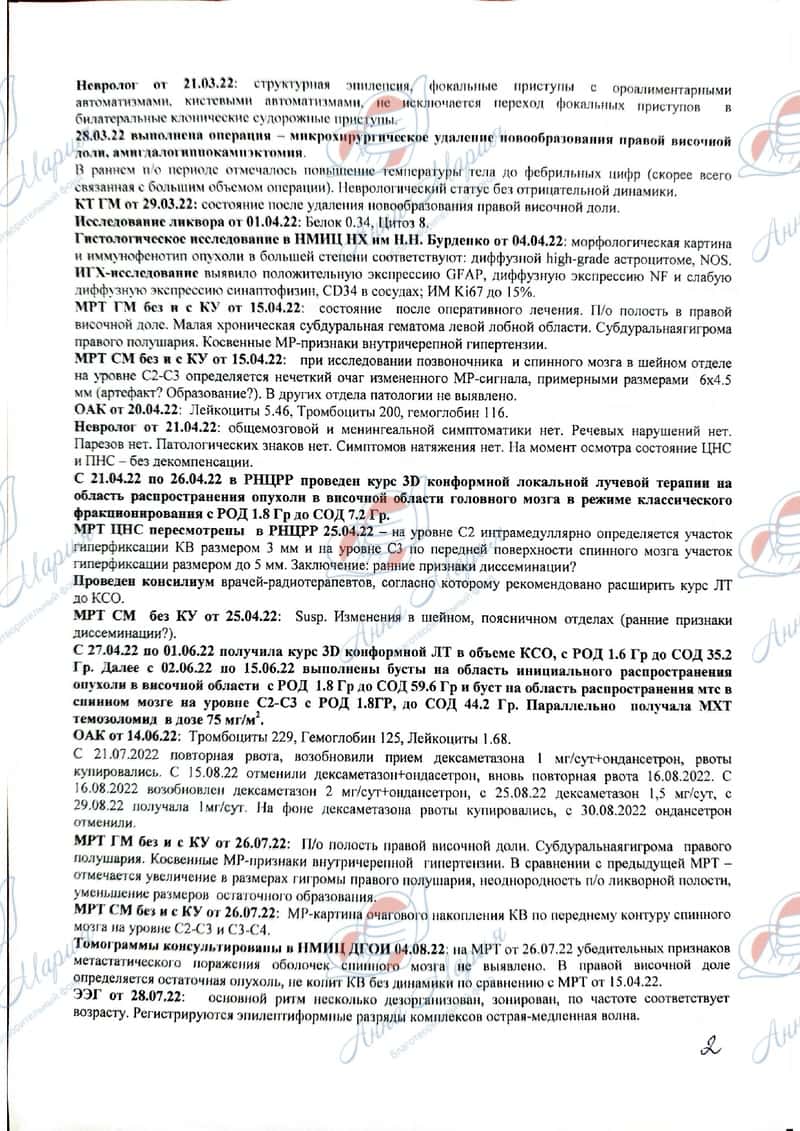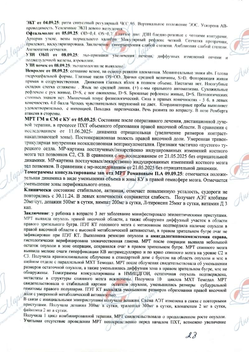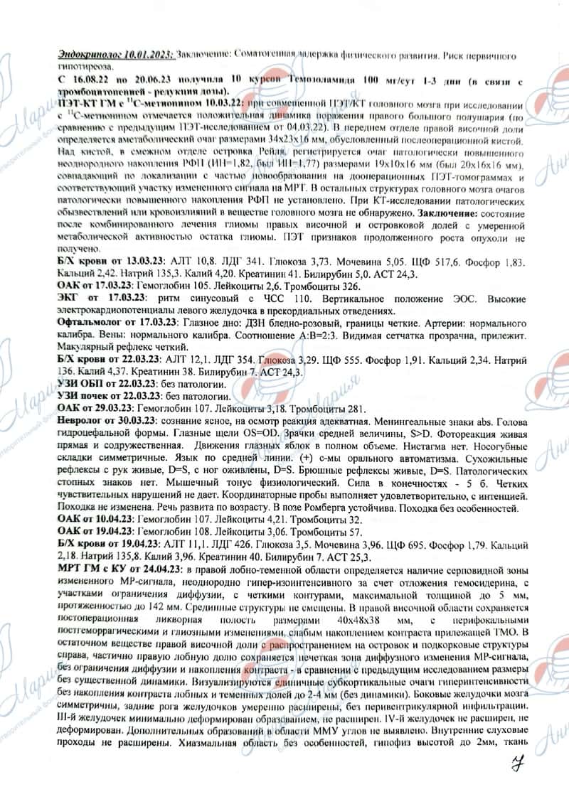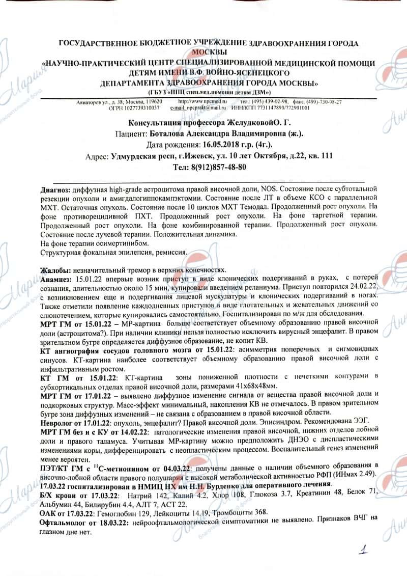 Проблемы со здоровьем у Саши начались с эпилептического приступа. Врачи направили ее на обследование в отделение нейрохирургии. Чтобы правильно поставить диагноз, пришлось сделать биопсию, и она лишь подтвердила худшие опасения – диффузная high-grade астроцитома (глиома) правой височно-лобной доли. Она возникает из глиальных клеток и отличается тем, что быстро прорастает в соседние участки мозга.