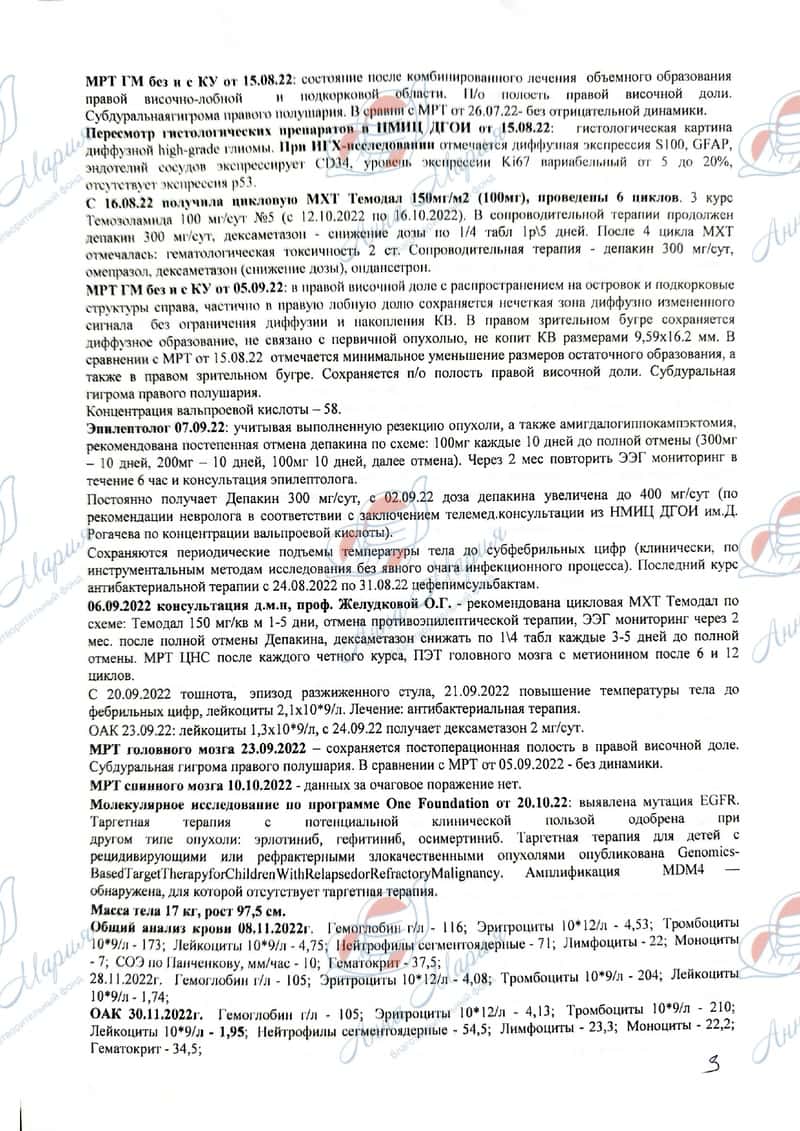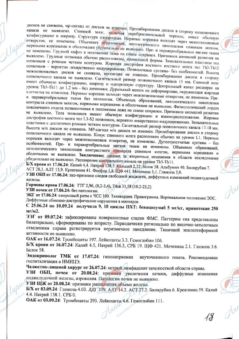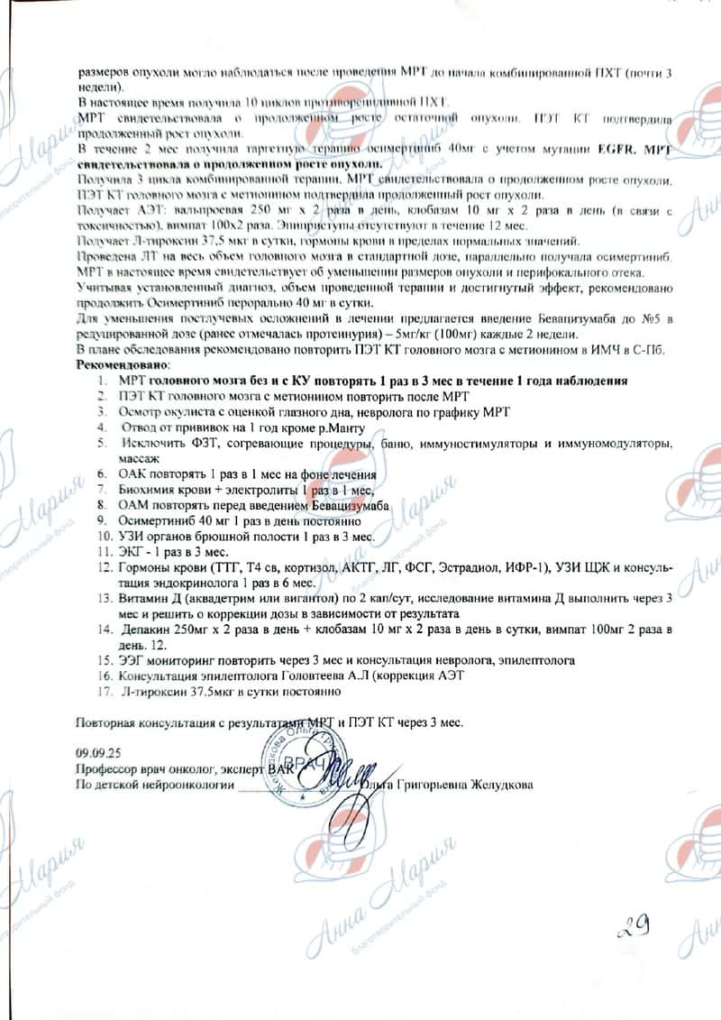 Саша начала проходить курсы химиотерапии и лучевую терапию в Москве. Каждые 10 курсов химиотерапии врачи меняли препарат, так как МРТ показывало «продолженный рост». Даже новый таргетный препарат, который был подобран по тестам в Германии и воздействовал на специфические молекулы в раковых клетках, не смог дать нужного результата и остановить рост опухоли. Далее к нему добавили «химию», которая убивала тромбоциты до такой степени, что Саше потребовалось переливание крови.