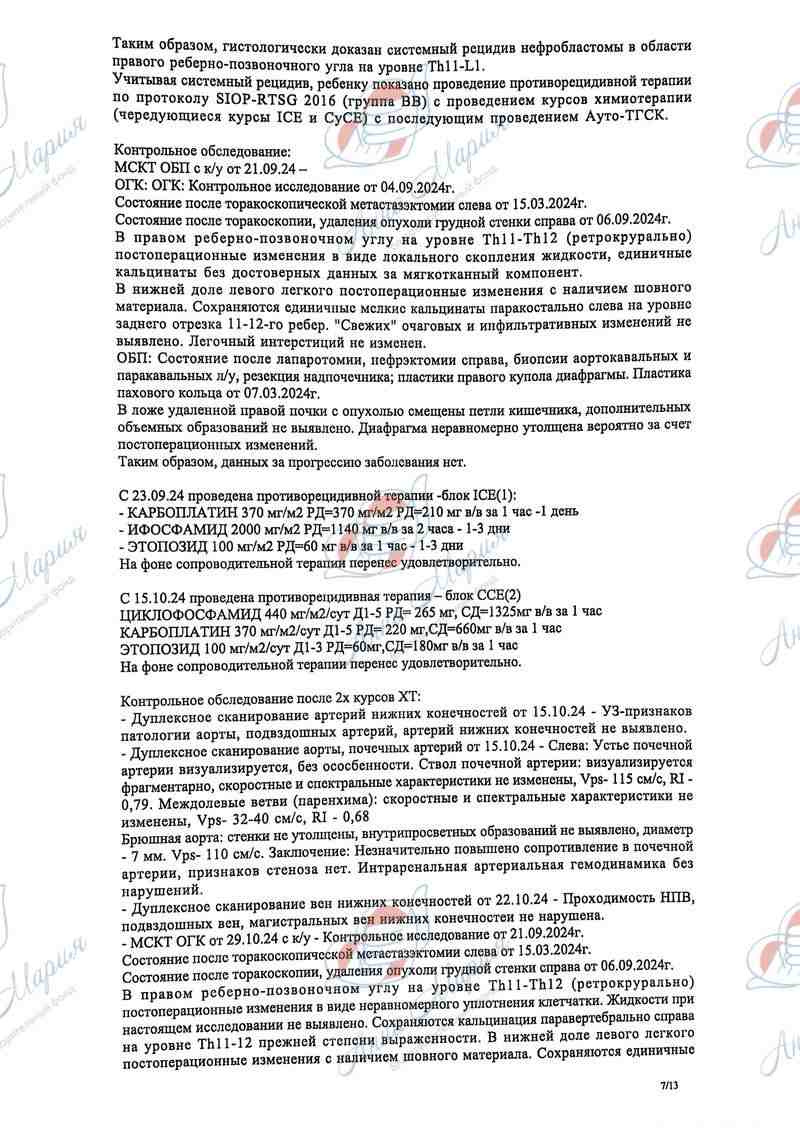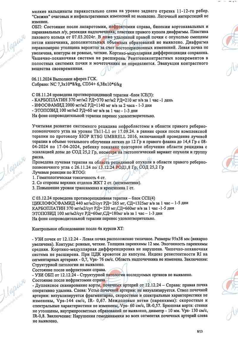 Дополнительно была пройдена лучевая терапия, позже – пересадка костного мозга. Пересадка костного мозга была показана, как один из вариантов консолидации лечения после высокодозной химии, которая ранее уничтожила все раковые клетки. Во время процедуры здоровые стволовые клетки, которые были взяты ранее, хирург ввел обратно с целью их восстановления и регенерации костного мозга и организма, в целом.
