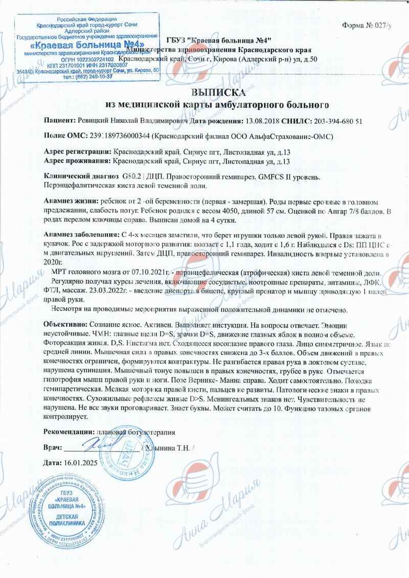 В семь месяцев на медицинском осмотре ребенку сделали КТ головного мозга, в результате которого невролог установил наличие порэнцефалической (атрофической) кисты левой теменной доли и поставил диагноз – перинатальное поражение головного мозга в форме правостороннего гемипареза, темповая задержка моторного развития, поздний период восстановления. Позже этот диагноз изменили на ДЦП.