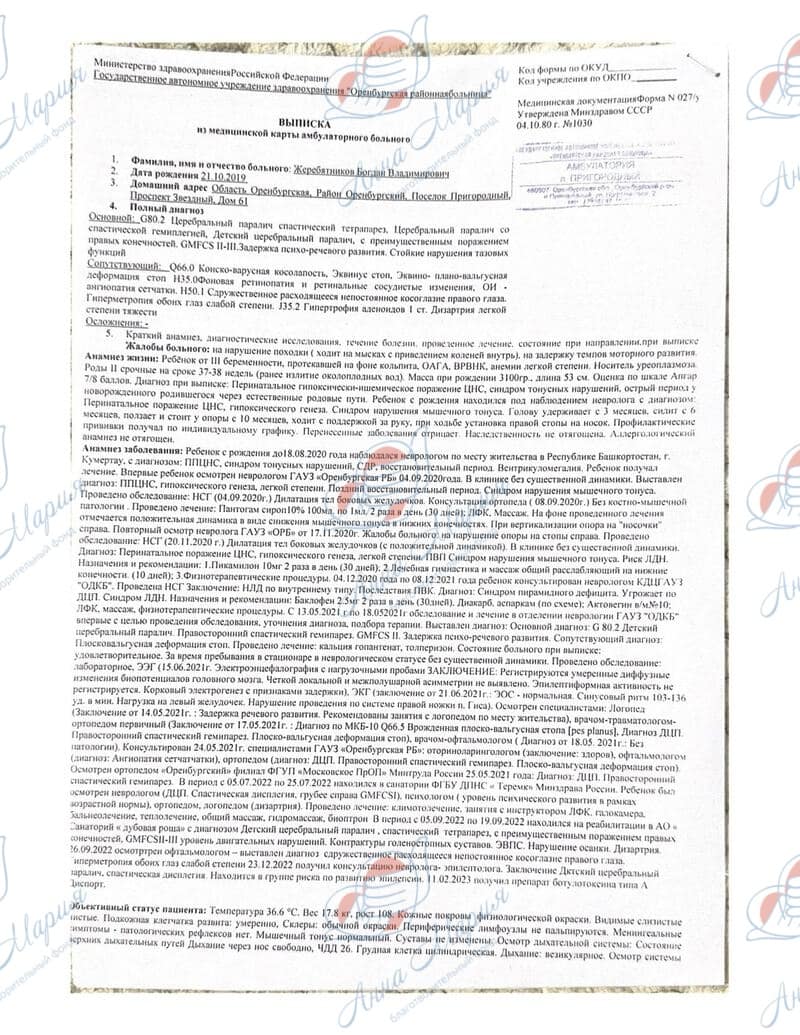 Мама Богдана собрала документы и отправила в клинику на рассмотрение. Доктор ответил, что эта операция необходима, и он может ее провести. И чем раньше наш подопечный начнет процесс подготовки, тем лучше будет результат лечения, нервная система успеет правильно сформироваться. Операция назначена на весну 2026 г.