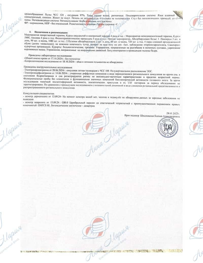 В декабре 2024 г. Богдану выполнили операцию в Институте педиатрии им. Вельтищева, Москва. Она прошла хорошо, и в течение 2025 г. было пройдено еще четыре курса реабилитации в центрах «Адели» и «Дубовая роща». Врачи посоветовали носить аппараты и ночные тутора, после чего самочувствие мальчика значительно улучшилось.