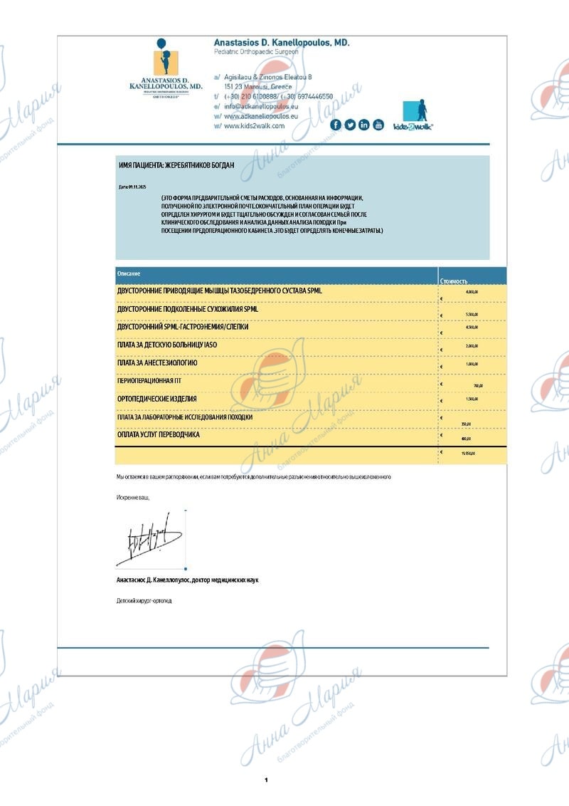 Сейчас Богдану 6 лет. Впереди его ожидают скачки роста, которые только ухудшат состояние – нужно принимать меры. В поисках эффективного метода лечения мама узнала о докторе Анастасиосе Канеллопулосе, который имеет большой опыт в детской хирургии и проводит операцию SPML. Суть операции заключается в том, что доктор выбирает зоны на ногах и с помощью маленькой иглы делает проколы мышечной фасции. Благодаря этому у мышцы появляется большой диапазон для работы, она также удлиняется.
