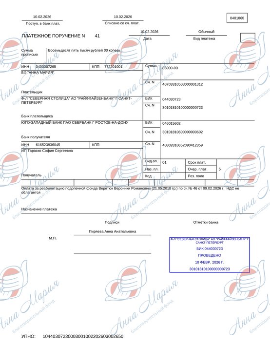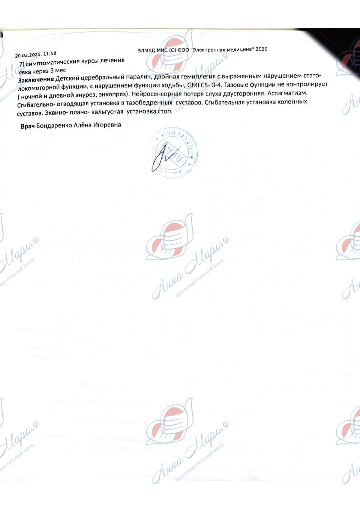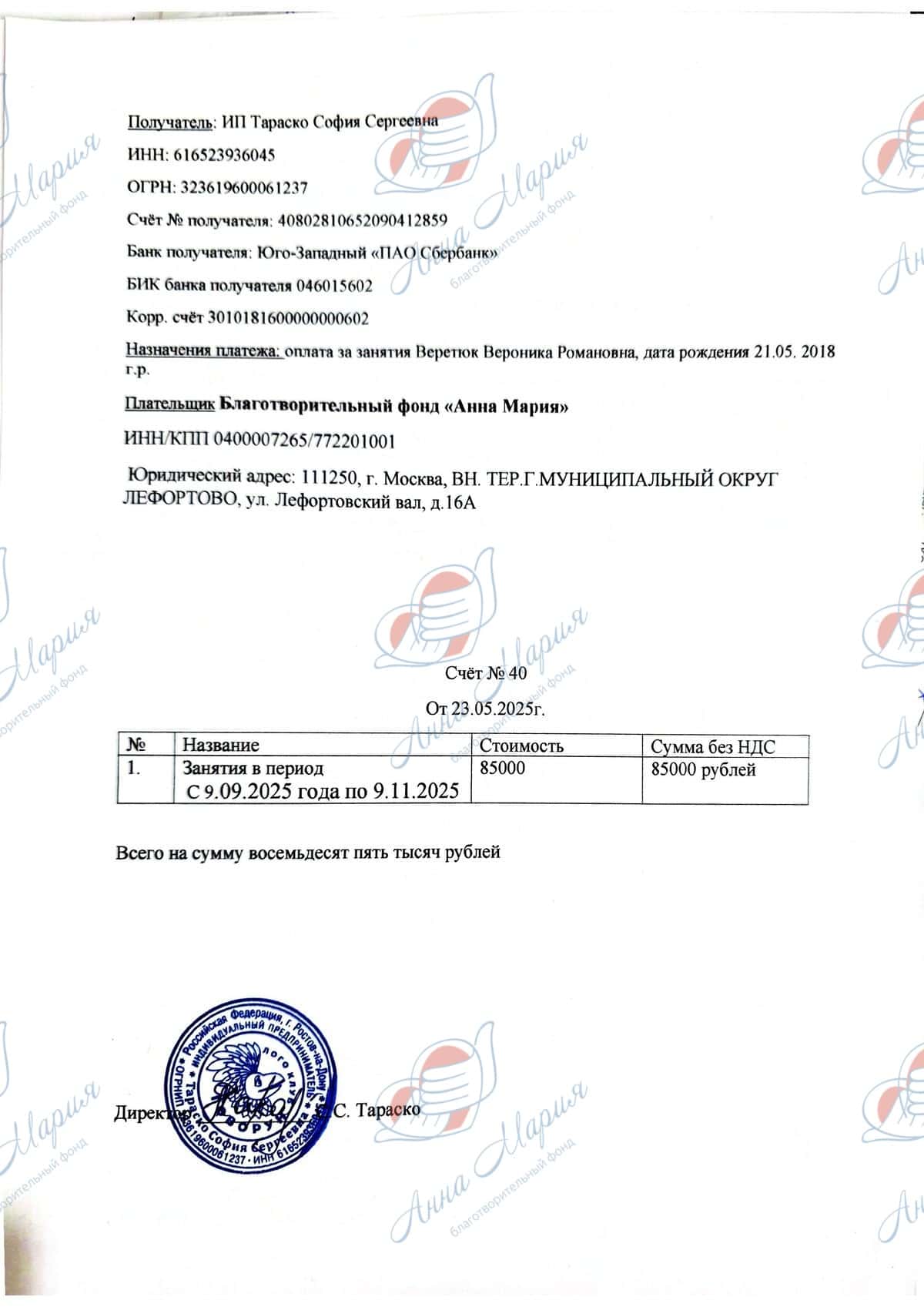 Сегодня Веронике требуется пройти очередной курс реабилитации в частном центре. Цена терапии – 85 000 руб. К сожалению, у семьи нет таких средств, чтобы покрывать все расходы, связанные с лечением дочери, и мама Вероники обратилась за помощью в благотворительный фонд «Анна Мария». Мы хотим помочь девочке и просим всех неравнодушных людей сделать пожертвование, чтобы закрыть этот сбор!