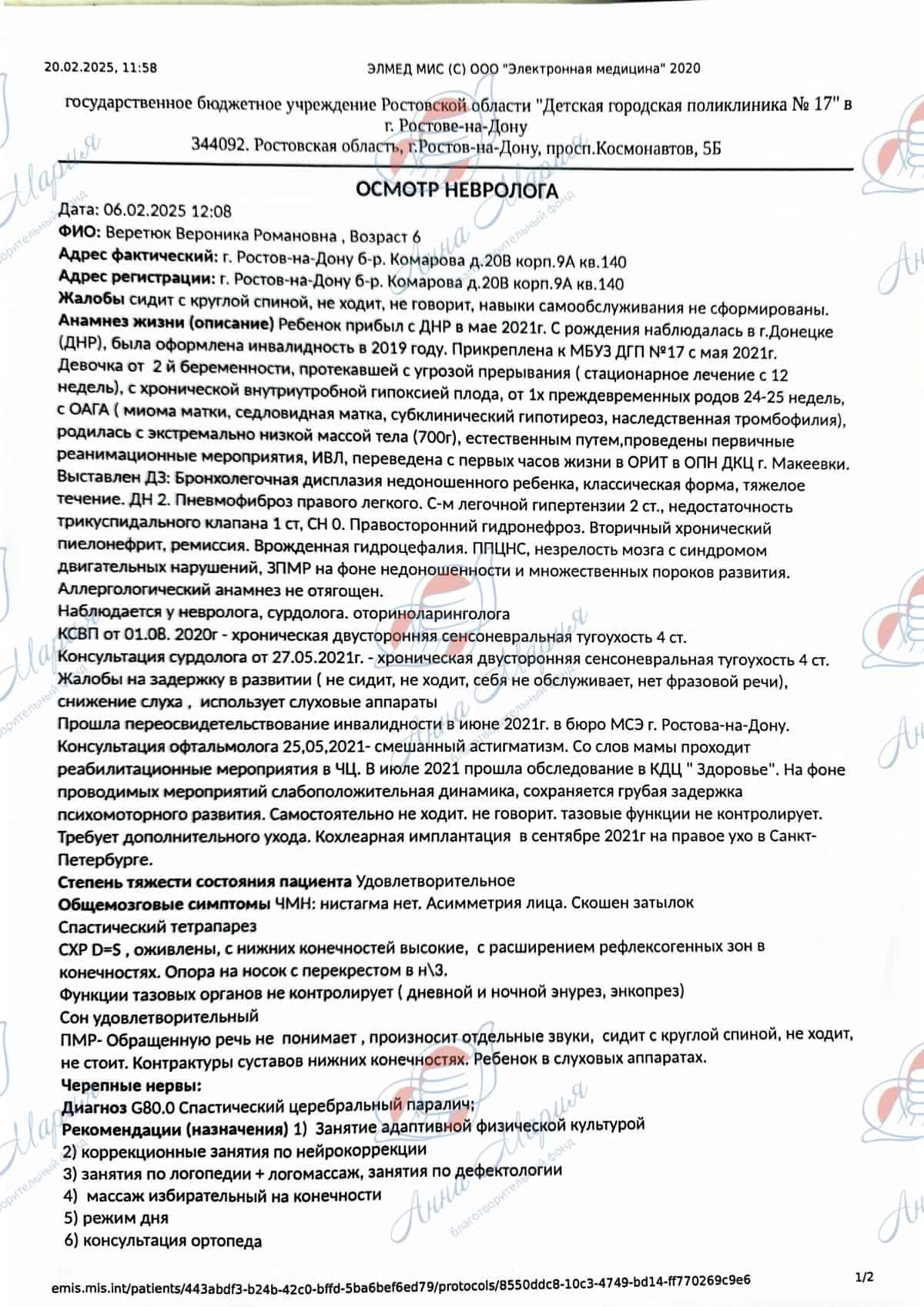 Что касается физического развития, на данный момент Вероника умеет самостоятельно сидеть и стоять у опоры. Ходьба ей пока дается с трудом, она становится на ножки только на ходунках или с поддержкой в две руки, с помощью родителей, врачей и специалистов. Радует то, что каждая реабилитация дает положительный результат!