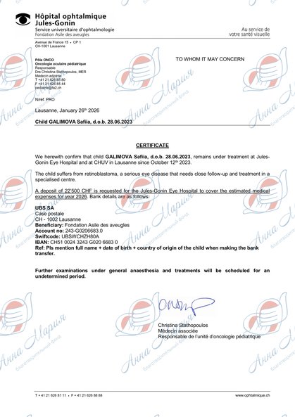 Родители были подавлены новостью и начали искать другие варианты лечения в России и за границей. Было направлено много запросов, и клиника Jiles Gonin в Швейцарии с хорошей репутацией дала положительный ответ. Хирург, который делает операции пациентам с подобным диагнозом, попросил выслать историю болезни и все выписки Сафии. После их изучения маме ответили, что об удалении глазика речи не идет – его можно спасти, а опухоль удалить другим, более щадящим способом.