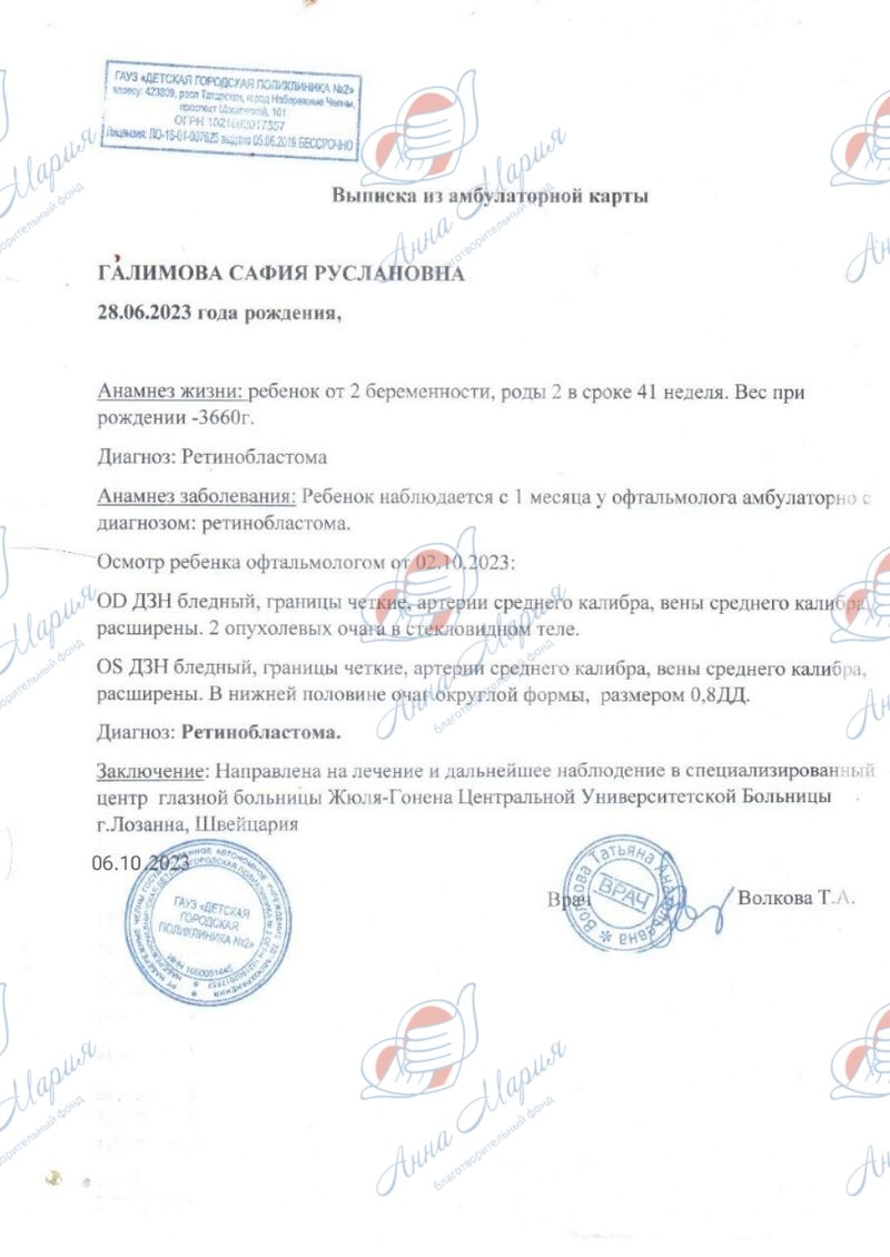 Теперь каждый месяц Сафии требуется обследование. Ретинобластома – коварная болезнь, которая в таком возрасте может быть непредсказуемой. Правильная диагностика необходима, чтобы в случае появления новых очагов заболевания врачи смогли быстро и вовремя принять меры для дальнейшего лечения и сохранения жизни девочки.