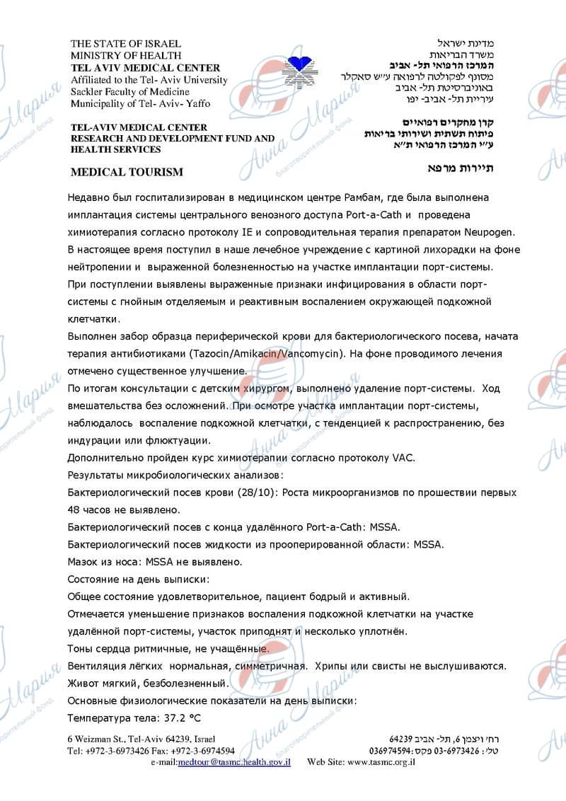 В качестве лечения Максим прошел первый пятидневный курс химиотерапии в клинике Рамбам. На пятый день на месте установки порта у него развилось заражение – попала инфекция, из-за чего порт пришлось удалять на следующий день под общим наркозом. Далее Максима перевели в онкологическое отделение клиники Ихилов, где он находится до сих пор. Стало ясно, что при лечении по данному протоколу он постоянно должен быть под контролем врачей, чтобы избежать негативных последствий.