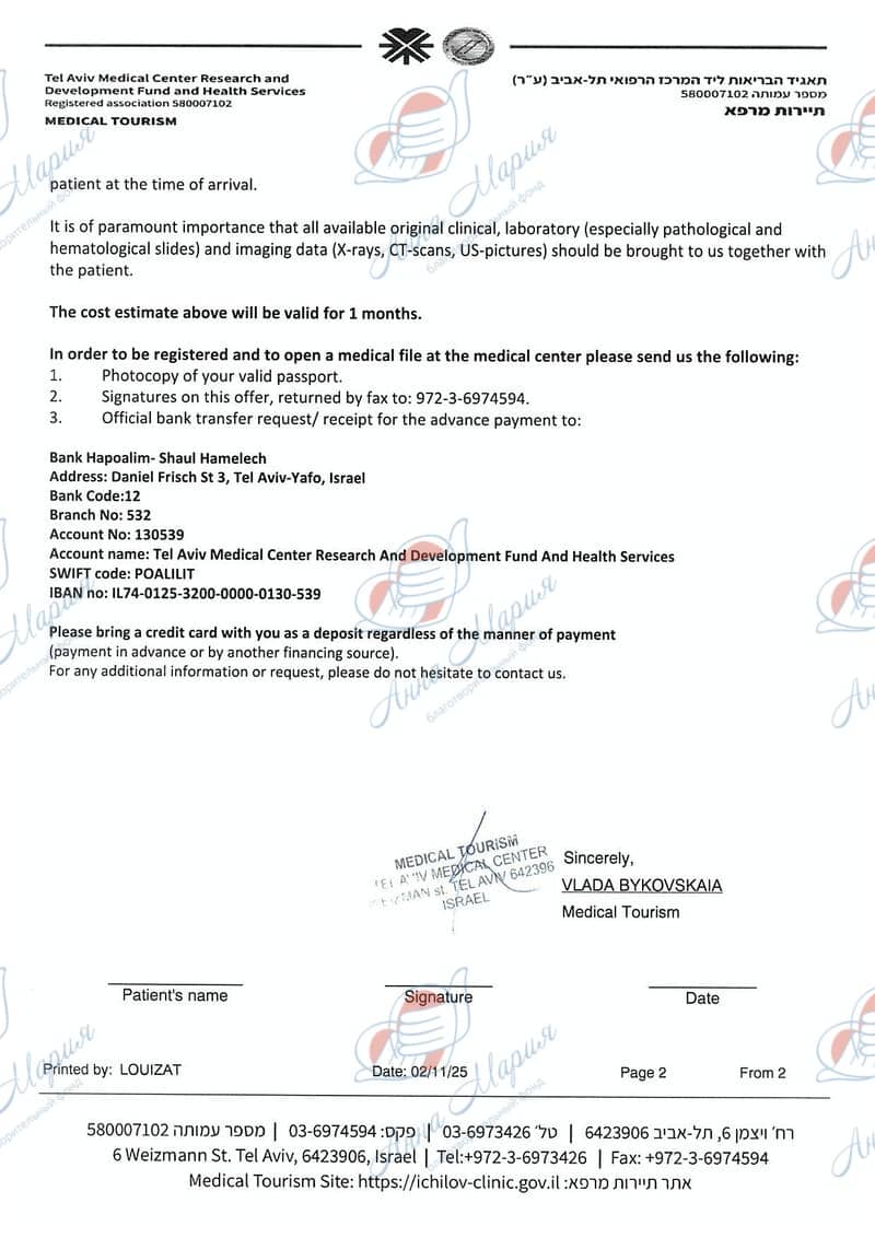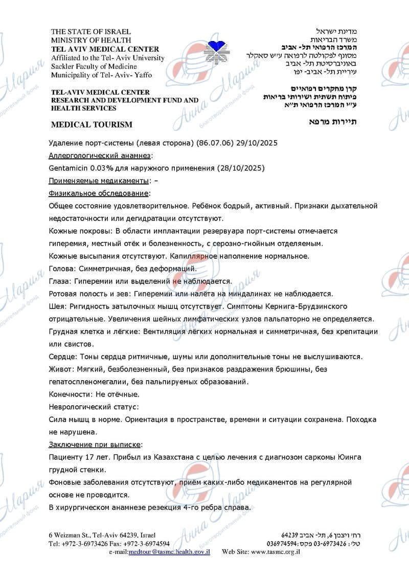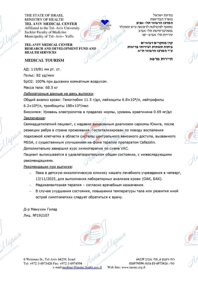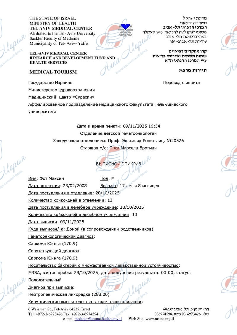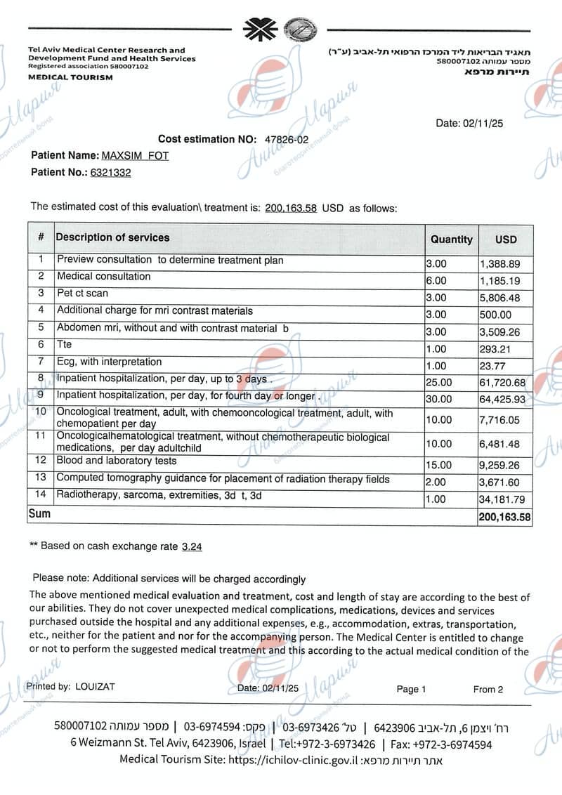 Максим с родителями приехал в Израиль на диагностику. Диагностика была проведена в частном порядке на собственные деньги и включила консультацию с врачом-онкологом, ПЭТ-КТ, МРТ грудной клетки с контрастом, повторную передачу стекол и парафиновых блоков для ИГХ, анализ крови, установку порт системы и прочее.