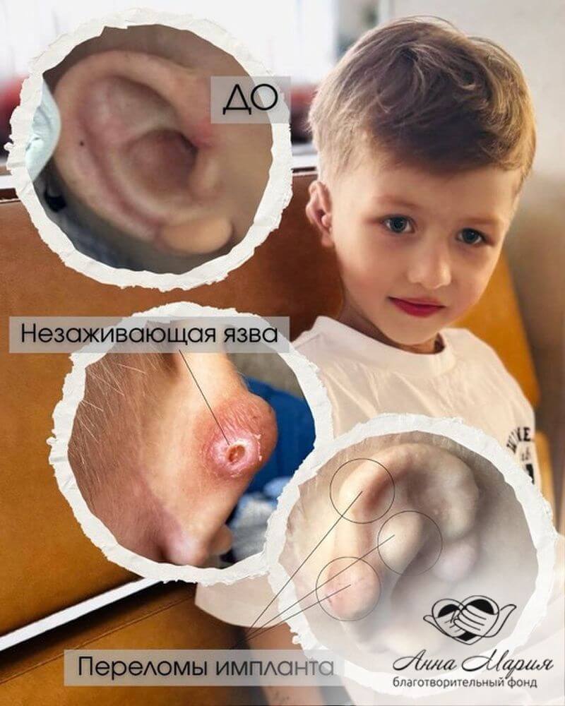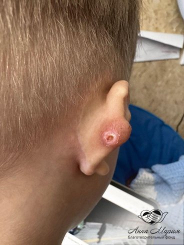 Имплантат, который поставили хирурги на правое ушко, сломался. Причина, почему это случилось, – неизвестна. Кроме того, что Демьян снова перестал слышать одним ушком, ситуация усугубилась тем, что имплантат прорвал кожу, и на этом месте образовалась рана, которую долгое время не удавалось заживить. Острый край истончил покров и сильно травмировал пересаженный кожный лоскут. На данный момент кожа в этом участке воспалена и имеет нехарактерную текстуру, яркий красный цвет вокруг.