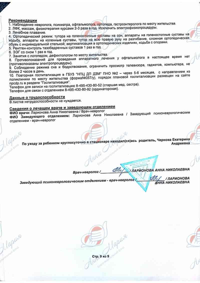 Операция прошла успешно, и врачи долгое время наблюдали положительную динамику – большая часть мышечной массы расслабилась. Но для полного закрепления результатов Даниилу требуется интенсивная реабилитация на регулярной основе – она не только улучшит состояние новых мышц, но и позволит приобрести новые навыки, в том числе стоять и со временем сделать свои первые шаги, научиться самостоятельно ходить. Сейчас Даниил умеет сидеть, ползать, а недавно стал понемногу разговаривать.
