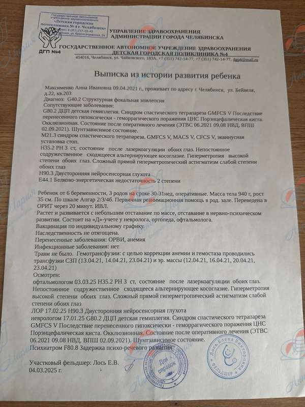 Из больницы Аню выписали не сразу, а когда она попала домой, то ей поставили несколько серьезных диагнозов: ДЦП, структурная фокальная эпилепсия, спастический тетрапарез, гидроцефалия, задержка речевого и психомоторного развития, другие.