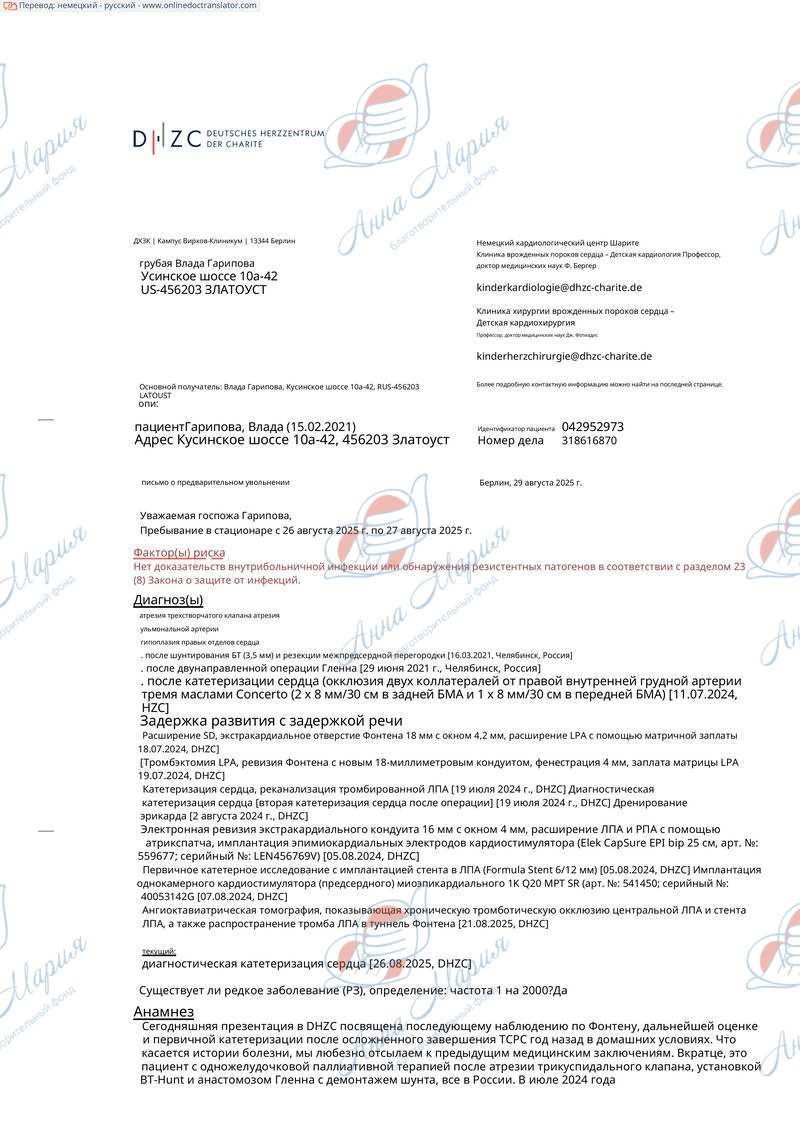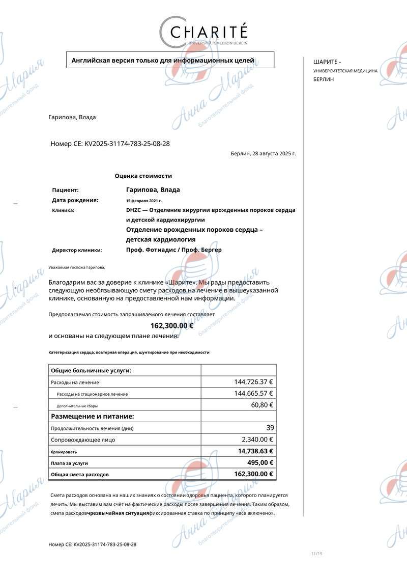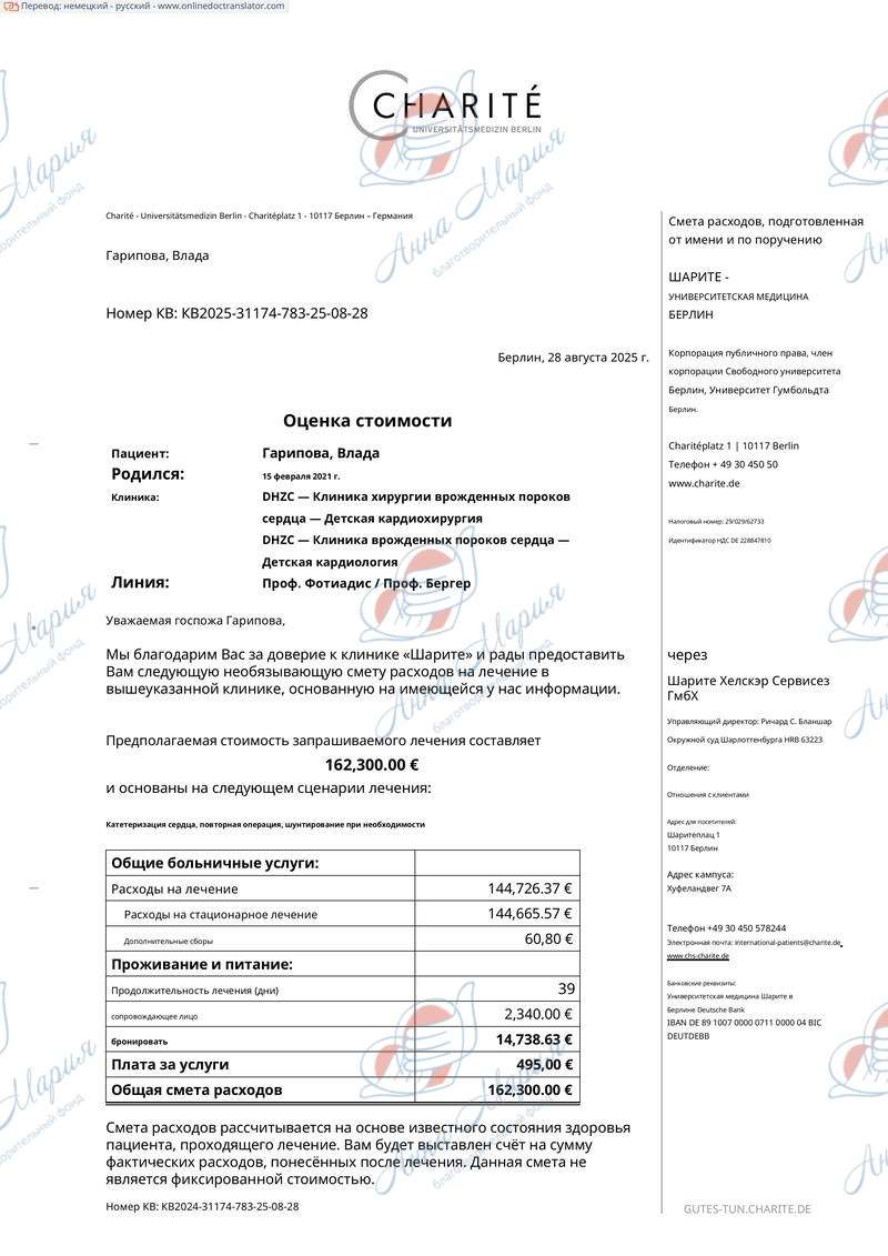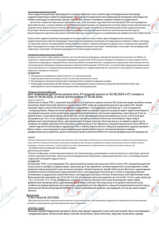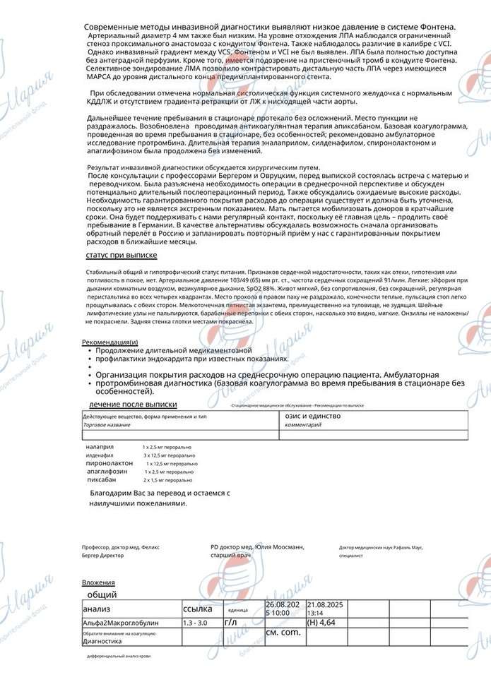 В августе 2025 г. Влада снова посетила Берлин, чтобы пройти контрольное обследование. К сожалению, после всех процедур врачи установили, что у Влады есть тромбы в левой легочной артерии, соответственно – через нее кровь не поступает в левое легкое, которое, в свою очередь, снабжается кислородом за счет коллатералей (сосудов).