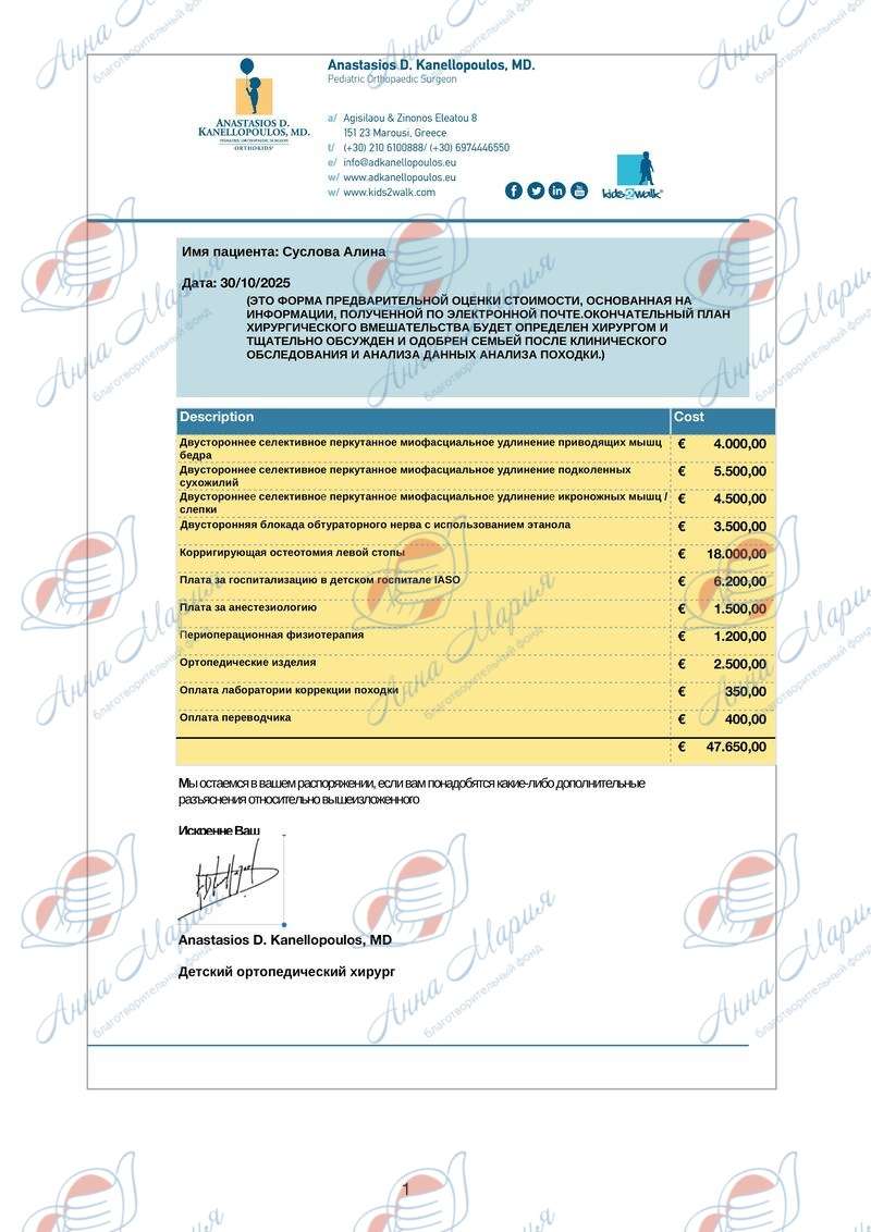 Семья обратилась за помощью к Dr. Anastasios Kanellopoulos, который принимает в клинике в Греции, и он согласился взять девочку на лечение. Благодаря лечению у Алины может стабилизироваться положение тазобедренного сустава, уйдет напряжение в ногах, мышцы станут функциональными, а девочка приобретет долгожданные навыки ходьбы.