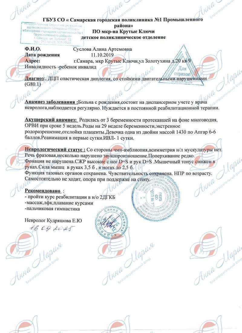 Семья Сусловых живет в городе Самара и воспитывает трех прекрасных дочерей. Так сложилось, что во время второй беременности мама Ольга родила двух однояйцевых близнецов, и одной из девочек Алине почти с рождения поставили диагноз ДЦП.