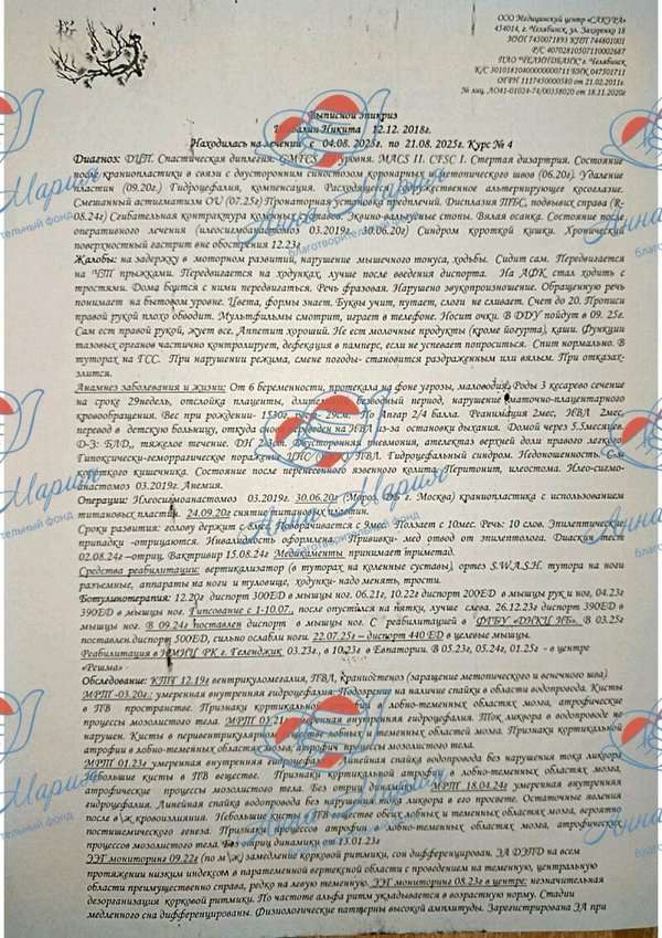 В один год Никите поставили диагноз «краниостеноз» – состояние, при котором несколько черепных швов срастаются преждевременно, мешают росту головного мозга, вызывают деформацию формы головы и лица, а впоследствии влекут нарушение развития, зрения, слуха и прочее. В связи с этим Никита пережил две серьезные операции на голове по установке и снятию титановых пластин. Несмотря на сложные диагнозы и плачевные прогнозы врачей, наш подопечный справился – и начал долгий путь своей реабилитации.