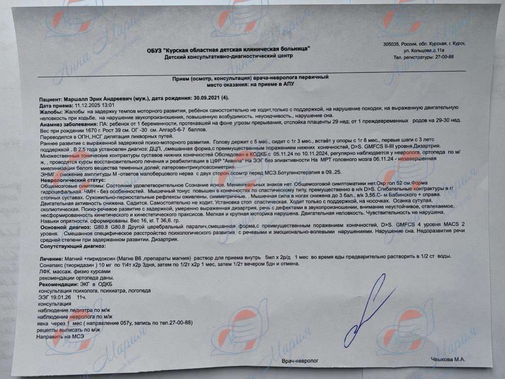 Эрик не прекращал терапию по показаниям – он занимался дома, к нему приходили врачи, они с мамой ездили в разные центры и клиники, как бесплатные, так и платные. Сейчас мальчику 4 года. Благодаря поддержке семьи и специалистов ему удалось достичь хороших результатов – каждый день он растет, развивается и приобретает новые знания. Он уже научился сидеть, прямо вставать, ходить с поддержкой и немного без нее.