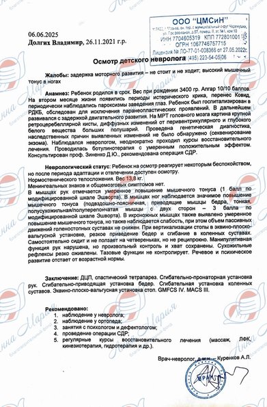 Многие симптомы указывают на то, что у Вовы ДЦП, общая задержка в развитии – как в физическом, так и в интеллектуальном плане, а также проблемы с моторикой. Основными проблемами остаются следующие: сильная спастика, которая ограничивает движения, спазмы, судороги. А еще его мучает дисплазия (нарушение в суставных структурах), нистагм и косоглазие. В своем возрасте он не умеет сидеть, стоять, ходить.