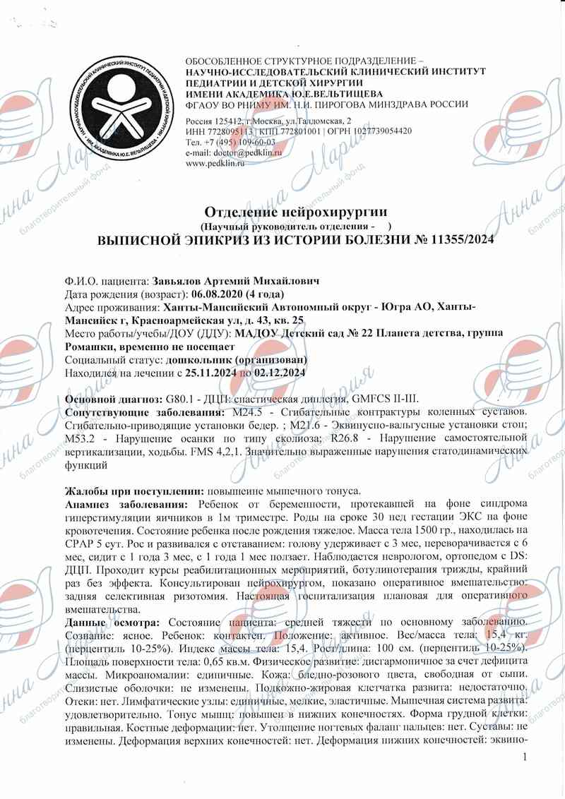 26.11.2024 г. Артемию выполнили тяжелую нейрохирургическую операцию СДР.