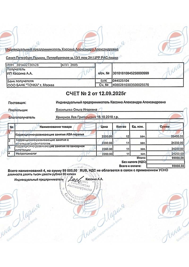 Лев живет с мамой, которая не в состоянии постоянной оплачивать курсы по реабилитации. Денег катастрофически не хватает, и в поисках помощи семья обратилась в благотворительный фонд «Анна Мария». Мы хотим помочь мальчику – внести оплату за курс, чтобы он получил новые навыки, преодолел страхи, сделал еще один шаг навстречу развитию. Мы будем благодарны, если вы сделаете пожертвование Льву! Все деньги пойдут строго на цели сбора, о чем мы сообщим дополнительно на нашем сайте. Спасибо!