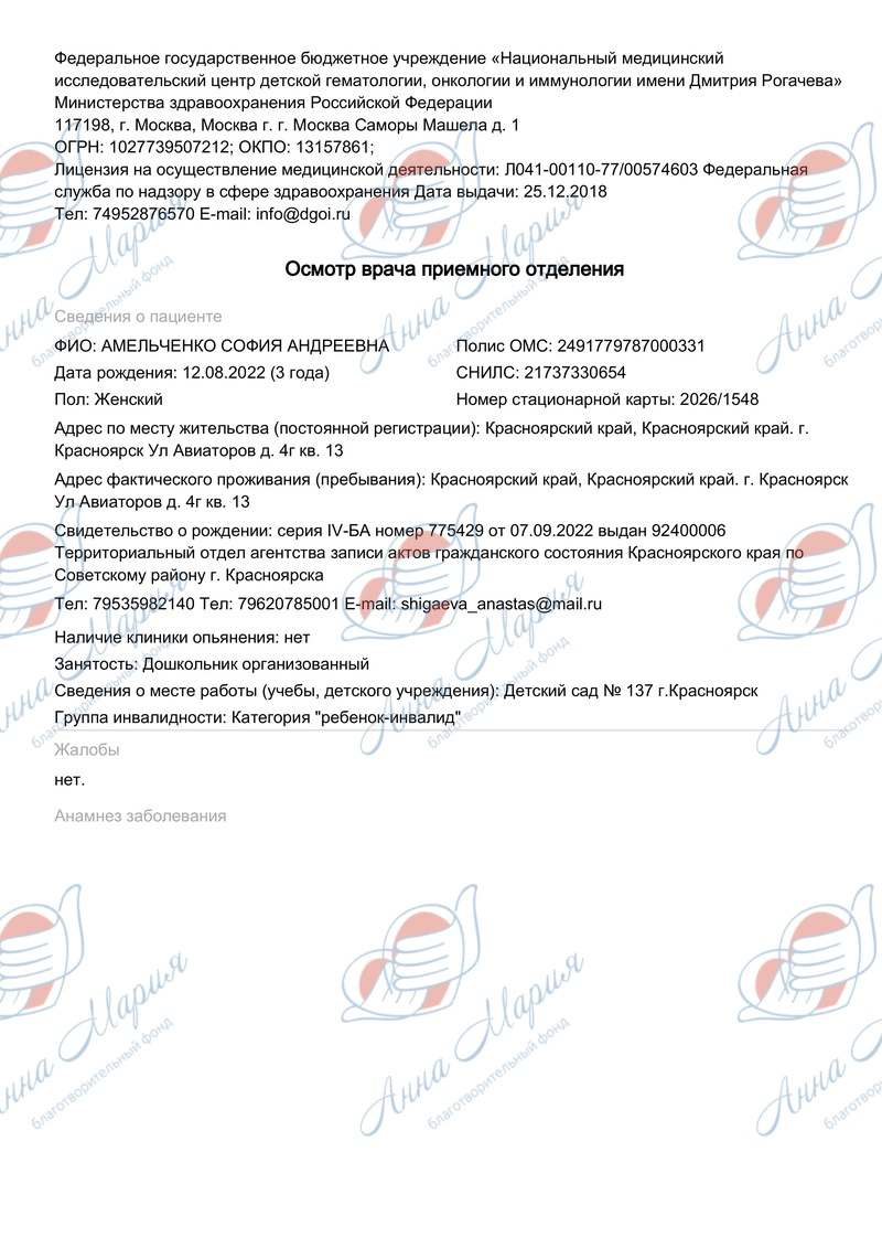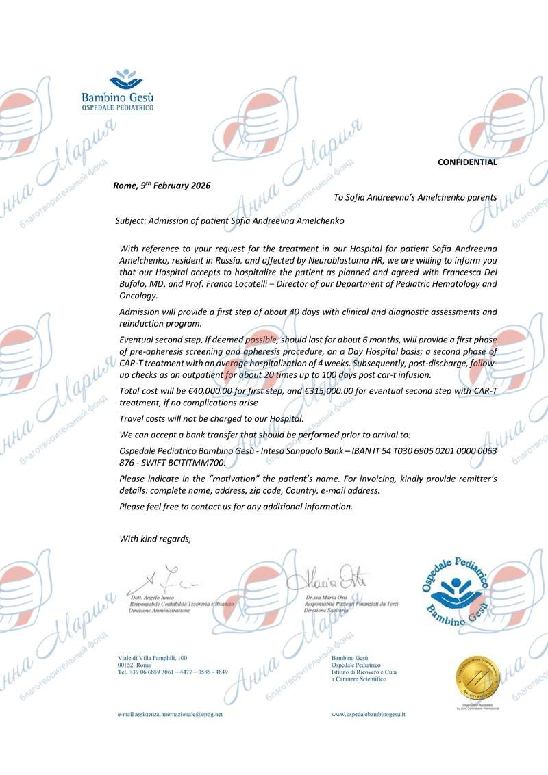 Специалисты клиники гарантируют, что лечение поможет спасти жизнь Софии. Цена вопроса – 36,5 млн. руб. Это огромные деньги – их нет у обычной российской семьи, зато есть огромное желание вылечить Софию. Фонд «Анна Мария» помогает маленькой девочке в сборе средств – мы будем благодарны, если вы сделаете любое пожертвование!