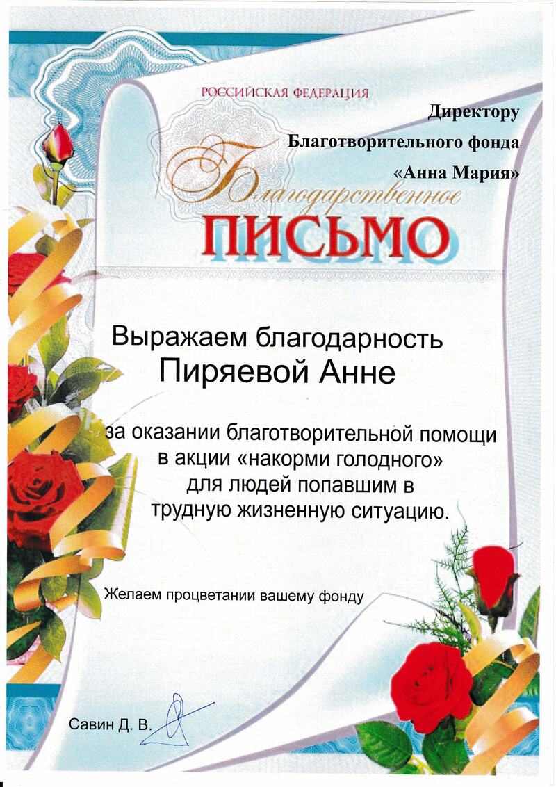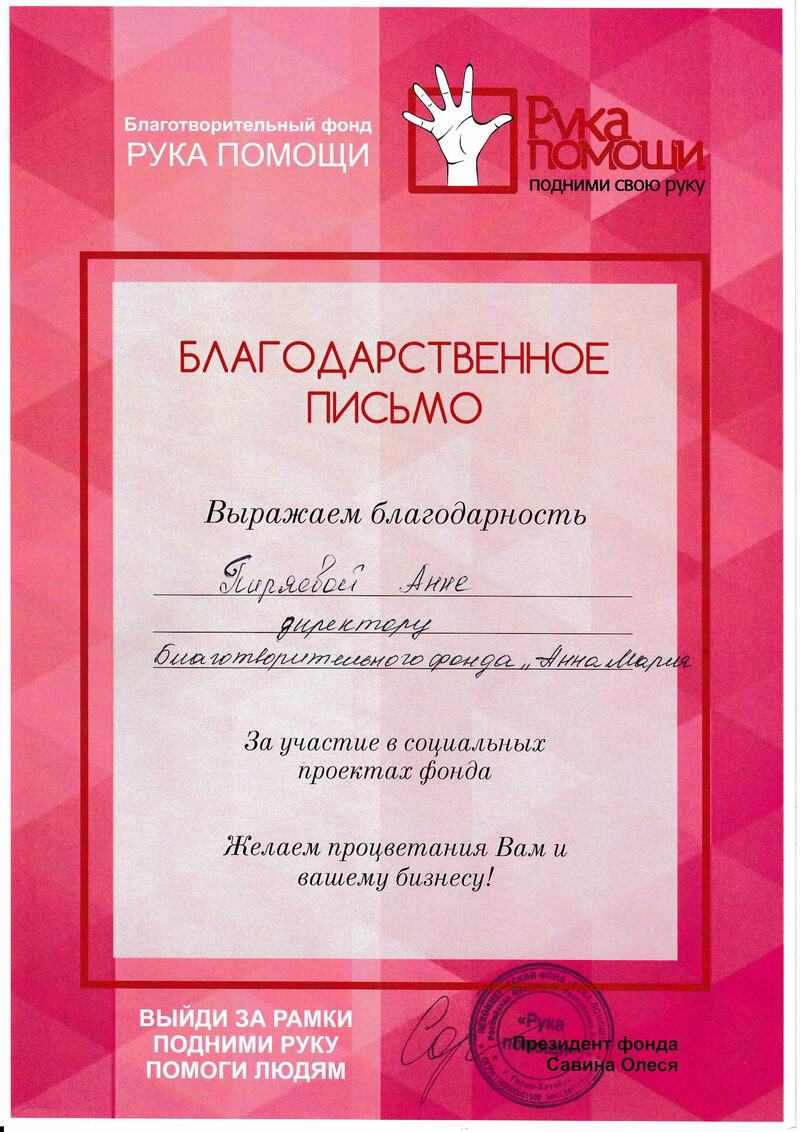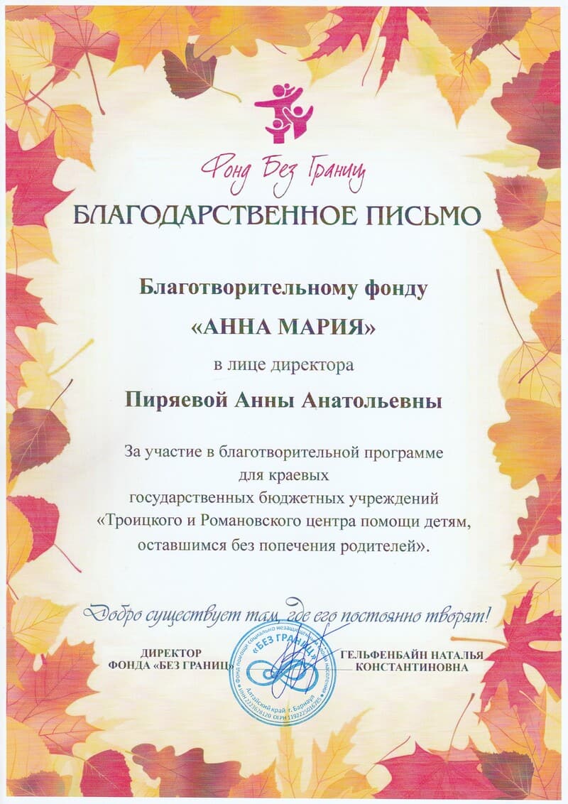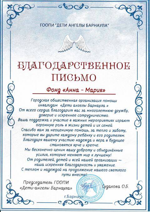 В этом разделе вы можете прочесть реальные отзывы о благотворительном фонде «Анна Мария». Мы публикуем мнения людей, которые сотрудничали с нами напрямую – это родители наших подопечных, партнеры, волонтеры, доноры, клиенты. На основании их слов благодарности вам будет легче принять решение насчет дальнейшей работы с нами.